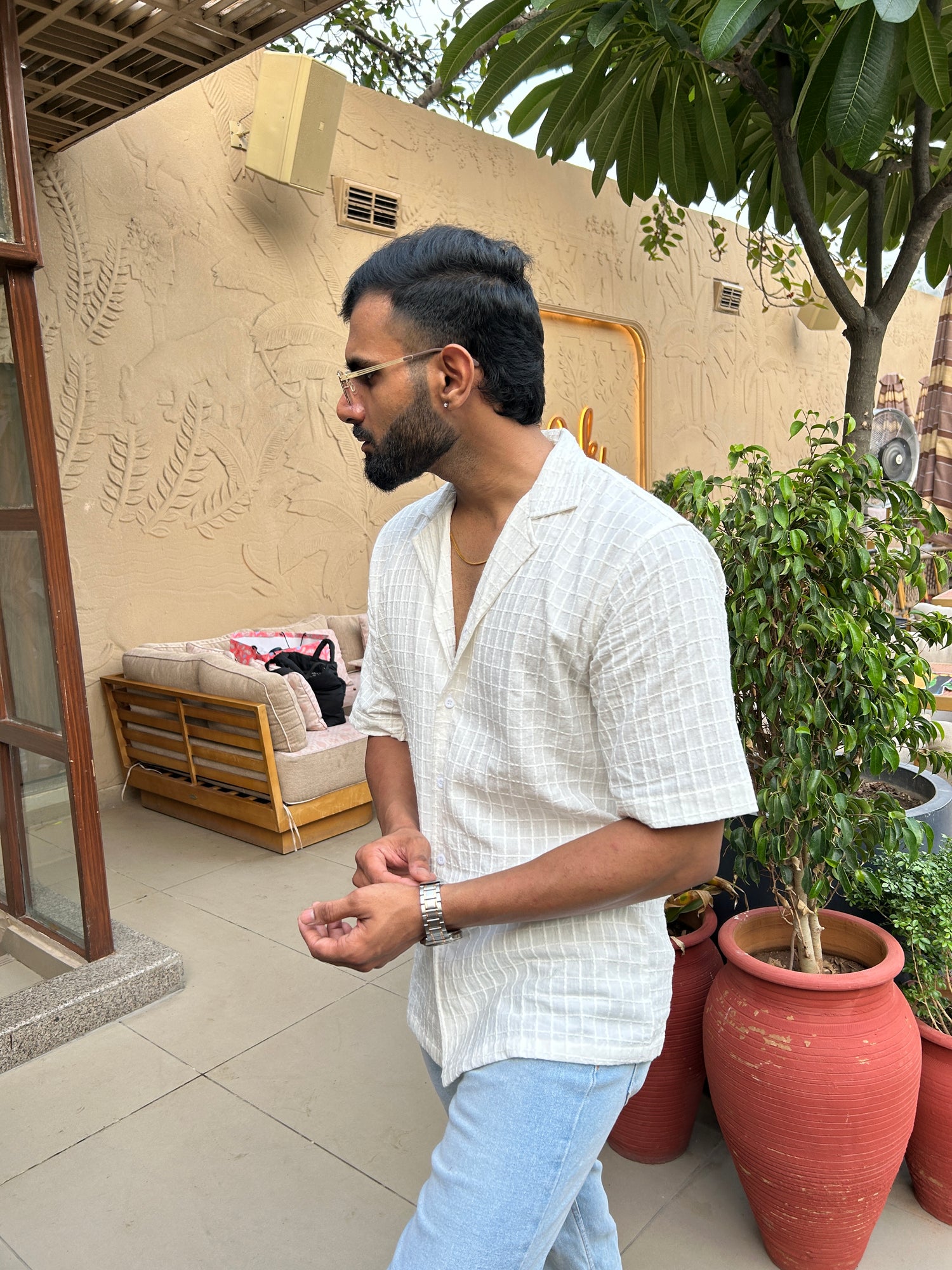 • A man sitting outdoors wearing sunglasses and a beige shirt